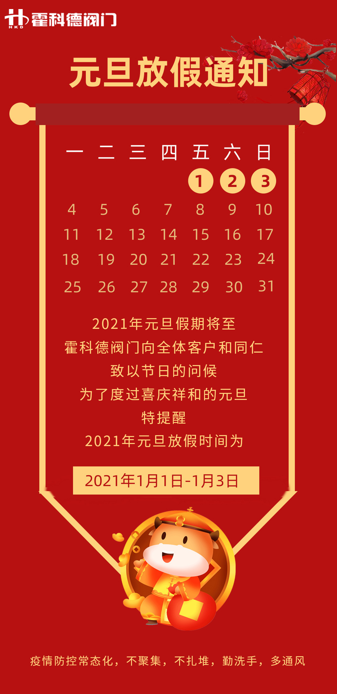 2021年湖北霍科德閥門有限公司元旦放假通知