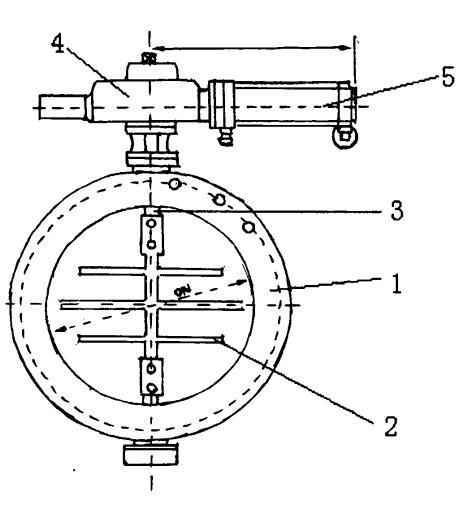 根據(jù)上述所述的氣動(dòng)板式塵氣蝶閥,其特征在于,閥體(1)上設(shè)有機(jī)械裝置(4)和通過機(jī)械裝置(4)對(duì)碟板(2)執(zhí)行啟閉的氣動(dòng)裝置(5)。